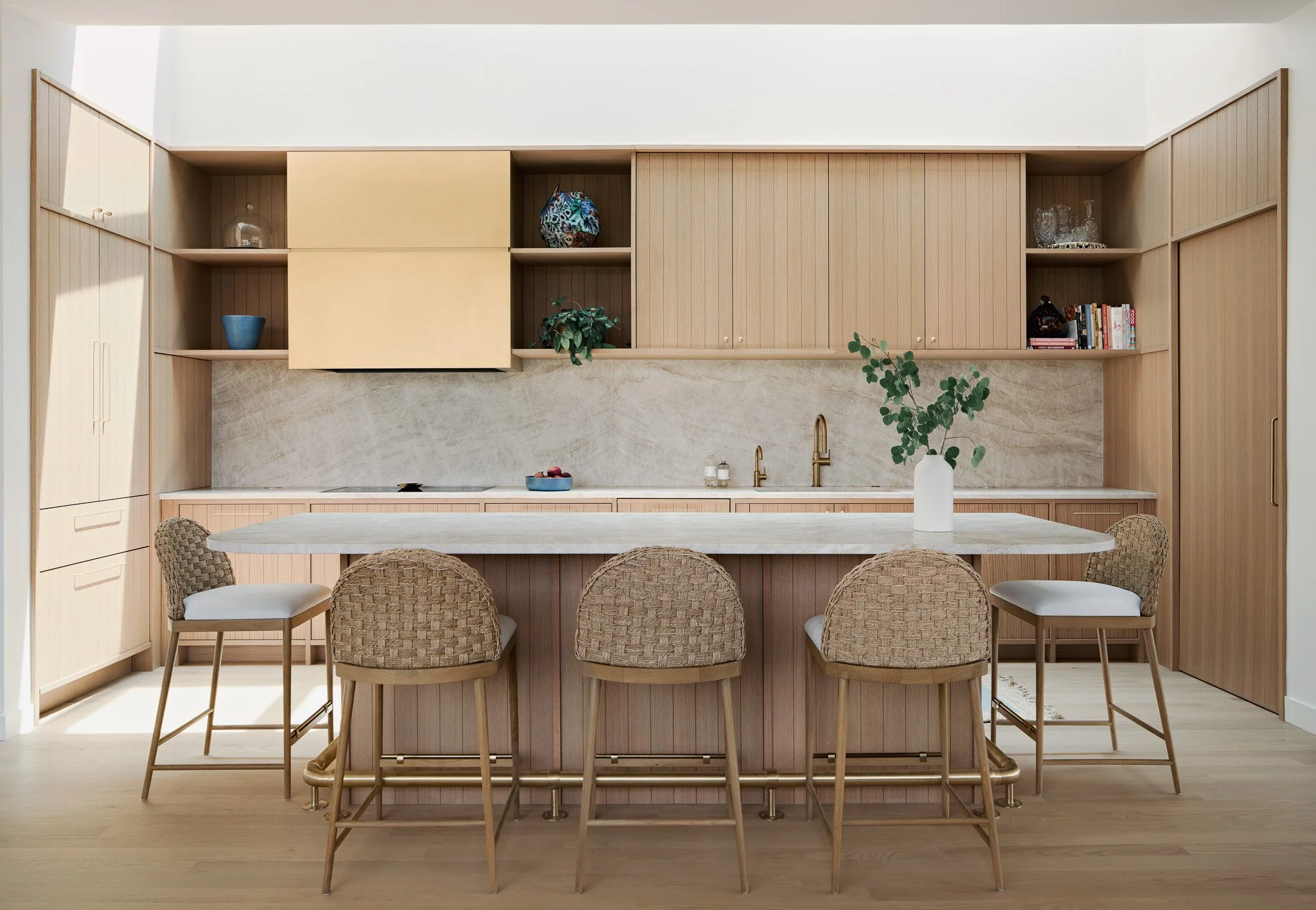 Brass accents and tranquil wood bring a quiet elegance, while an expansive skylight welcomes the morning sun. This was a special request from the clients—wanting those first rays of light to pour in as they begin their day. Even though the home’s orientation faces the savanna, the skylight allows the kitchen to greet the sunrise, adding a daily moment of warmth and connection.